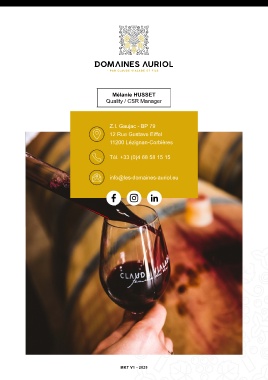 Mélanie HUSSET Quality / CSR Manager Z.I. Gaujac - BP 79 12 Rue Gustave Eiffel 11200 Lézignan-Corbières Tél. +33 (0)4 68 58 15 15 info@les-domaines-auriol.eu MKT V1 - 2025