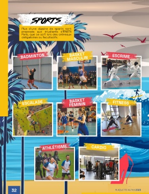 SPORTS Plus d’une dizaine de sports sont proposés aux étudiants d’ENSTA Paris, que ce soit lors des créneaux obligatoires ou facultatifs. BASKET BADMINTON MASCULIN ESCRIME ESCALADE BASKET FITNESS FÉMININ ATHLÉTISME CARDIO 32 PLAQUETTE ALPHA 2023