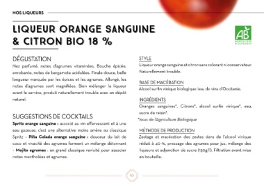 Nez parfumé, notes d’agrumes vitaminées. Bouche épicée, Liqueur orange sanguine et citron sans colorant ni conservateur.